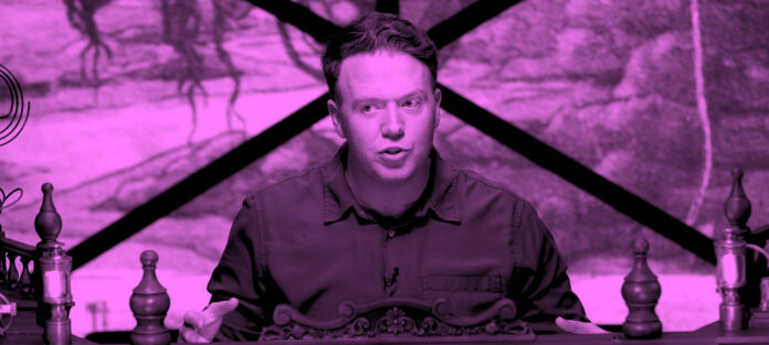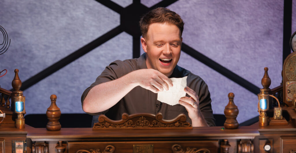 Brennan Lee Mulligan behind the Dungeon Master Screen of Dimension 20’s Cloudward Ho. Photo by Kate Elliot.